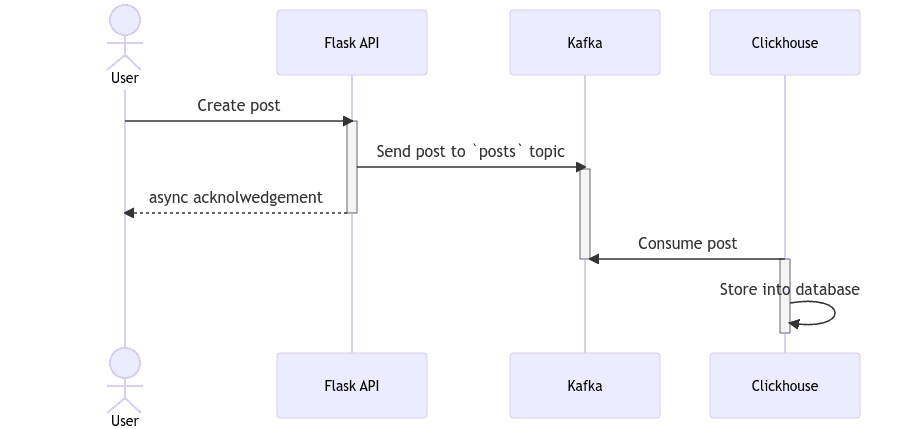 python# app.py# fun fact: This snippet was generated entirely by Copilotfrom flask import Flask, requestfrom kafka import KafkaProducerfrom datetime import datetimeimport jsonapp = Flask(__name__)producer = KafkaProducer(bootstrap_servers=['kafka:9093'],value_serializer=lambda v: json.dumps(v).encode('utf-8'))@app.route('/posts', methods=['POST'])def create_post():post = request.get_json()# clickhouse can only parse strings without millisecondspost['created_at'] = datetime.now().strftime("%Y-%m-%dT%H:%M:%S")producer.send('posts', post)return 'ok'